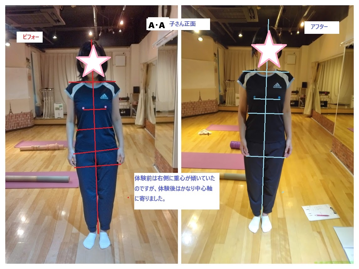 体験前には、身体が右側に傾いて重心全体が右に傾いていました。